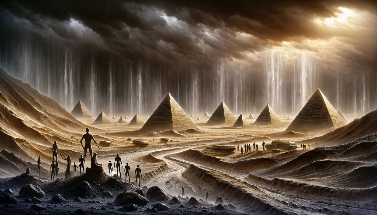 The various Mars RV sessions described pyramid like structures and major geological disturbances. They also mention tall, thin figures having experienced environmental collapse. John Greenewald, Jr. (X handle: @blackvaultcom) fed this information into the AI image generator DALL-E, which then produced the two images detailing landscapes with pyramids and figures featured in this section.